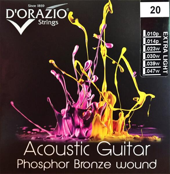 D'orazio akusztikus gitár húrok. Hatszögletű acél mag foszfor-bronz tekercseléssel. Méretek:. 012 . 016 . 024 . 032 . 042 . 053