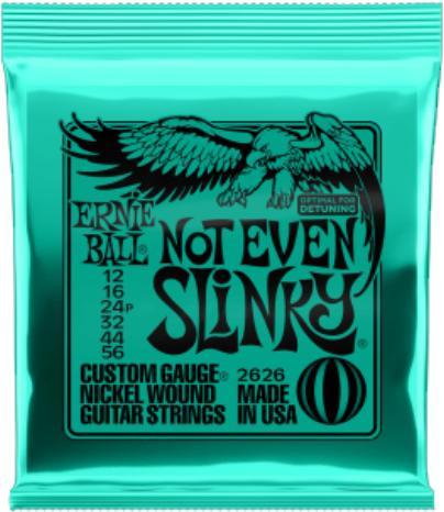 Az Ernie Ball Not Even Slinky húrokat elsősorban azoknak ajánljuk akik szeretik a mély hangolást a gitárjukon. A metálzenészek világszerte azért tették le voksukat a Not Even Slinky Slinky mellett mert optimális a húrok átmérője a drop D és drop C hangoláshoz. Ezek a húrok a precíz gyártásnak köszönhetően tökéletes összetételűek, optimális játékérzetet nyújtanak és hosszú az élettartamuk. A Not Even Slinky sodort húrjai nickel bevonatú acélhúrok melyek egy hatszögletű acél vezetőszál köré vannak tekerve. A sima húrok vékony bevonatú karbon acélból készülnek, ezzel nyújtva a tökéletesen kiegyensúlyozott hangot a gitárodnak. A húrok átmérője . 012 . 016 . 024p . 032 . 044 . 056